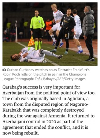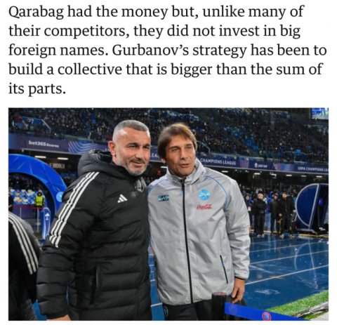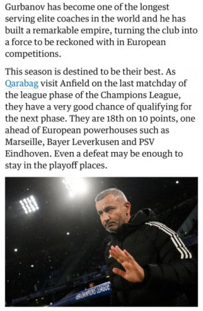 Yazıda “Qarabağ”ın Qurban Qurbanovun başçılığı altında beynəlxalq turnirlərdə yaxşı nəticələr qazandığı, avrokuboklarda müntəzəm iştirak etdiyi və 2017-ci ildə UEFA Çempionlar Liqasının qrup mərhələsində mübarizə apardığı qeyd olunub. “The Guardian” xatırladır ki, turnir cədvəlində 18-ci pillədə qərarlaşan komandanın bu yolda növbəti sınağı “Enfild”də “Liverpul”a qarşı olacaq. Bildirilib ki, Azərbaycan çempionu pley-off mərhələsinə vəsiqə qazanmaq şansını qoruyur.