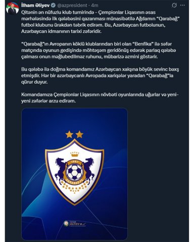 Qitənin ən nüfuzlu klub turnirində - Çempionlar Liqasının əsas mərhələsində ilk qələbəsini qazanması münasibətilə Ağdamın “Qarabağ” futbol klubunu ürəkdən təbrik edirəm. Bu, Azərbaycan futbolunun, Azərbaycan idmanının tarixi zəfəridir.