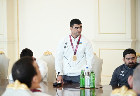 Yunan-Roma güləşçisi Həsrət Cəfərov dedi: Cənab Prezident, ilk növbədə, Sizi salamlayıram. Bizi qəbul etdiyiniz üçün çox sağ olun. Bildiyiniz kimi, Albaniyanın paytaxtı Tiranada keçirilən Avropa çempionatında qızıl medal qazandım. Bu, mənim ümumilikdə dördüncü qızılımdır və yarış həqiqətən də çox çətin keçdi. Dördqat Avropa çempionu kimi Azərbaycan yunan-Roma güləşi tarixində bir rekorda imza atdım. Bizi belə dəstəklədiyiniz, bizə göstərdiyiniz diqqət və qayğı üçün Sizə öz təşəkkürümüzü bildiririk. Sizin diqqət və qayğınız bizim üçün ən böyük məsuliyyətdir. Çox sağ olun.