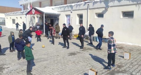 Van Polis idarəsinin əməkdaşları Malatyadan köçürülmüş və bir idman zalına yerləştirilən uşaqlara oyuncaq hədiyyə edib, sonra onlarla futbol oynayıblar.